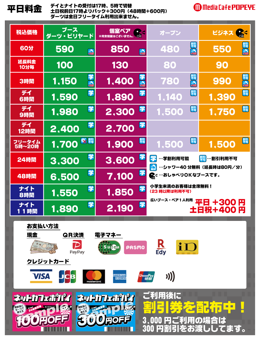 | シャワールーム | 1室 | 長時間パック利用のお客様 40分無料 1時間、3時間のお客様は+100円 延長料金 80円/10分 | |||